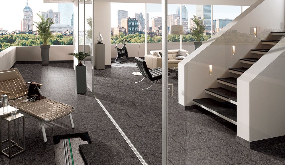 Structured, with strong cubic effect, Nextone fine natural but irregular texture dotted with elegant burnished tones, highlights the Grand and elegant atmosphere of the space.